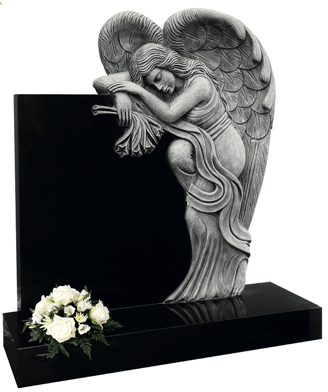 Example Image Shows: All Polished Black Granite Beautifully carved angel reflecting a sad loss (angel shown in antique finish)