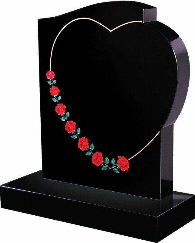 Example image shows: All Polished Black. This shaped memorial shows the contours of the heart, finished off with Hand Painted Roses to summarise the heart with Gold Pin Line.
