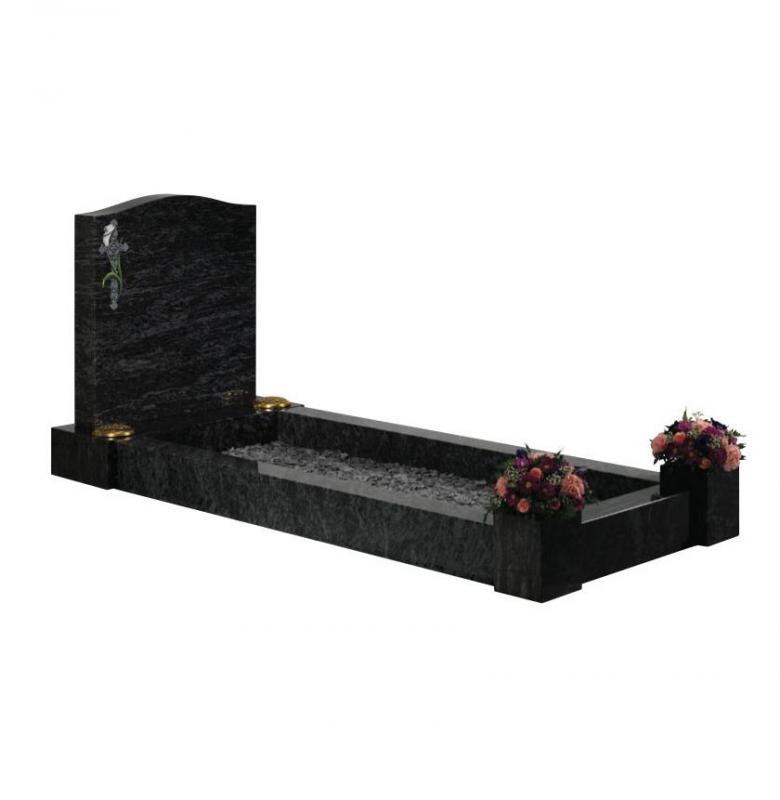 Example Image Shows: All Polished Heather Blue. This memorial uses a ‘lawn type’ nheadstone and base which has been converted into full kerb style memorial (Memorial shown with optional hand painted cross and lily design HP 113)