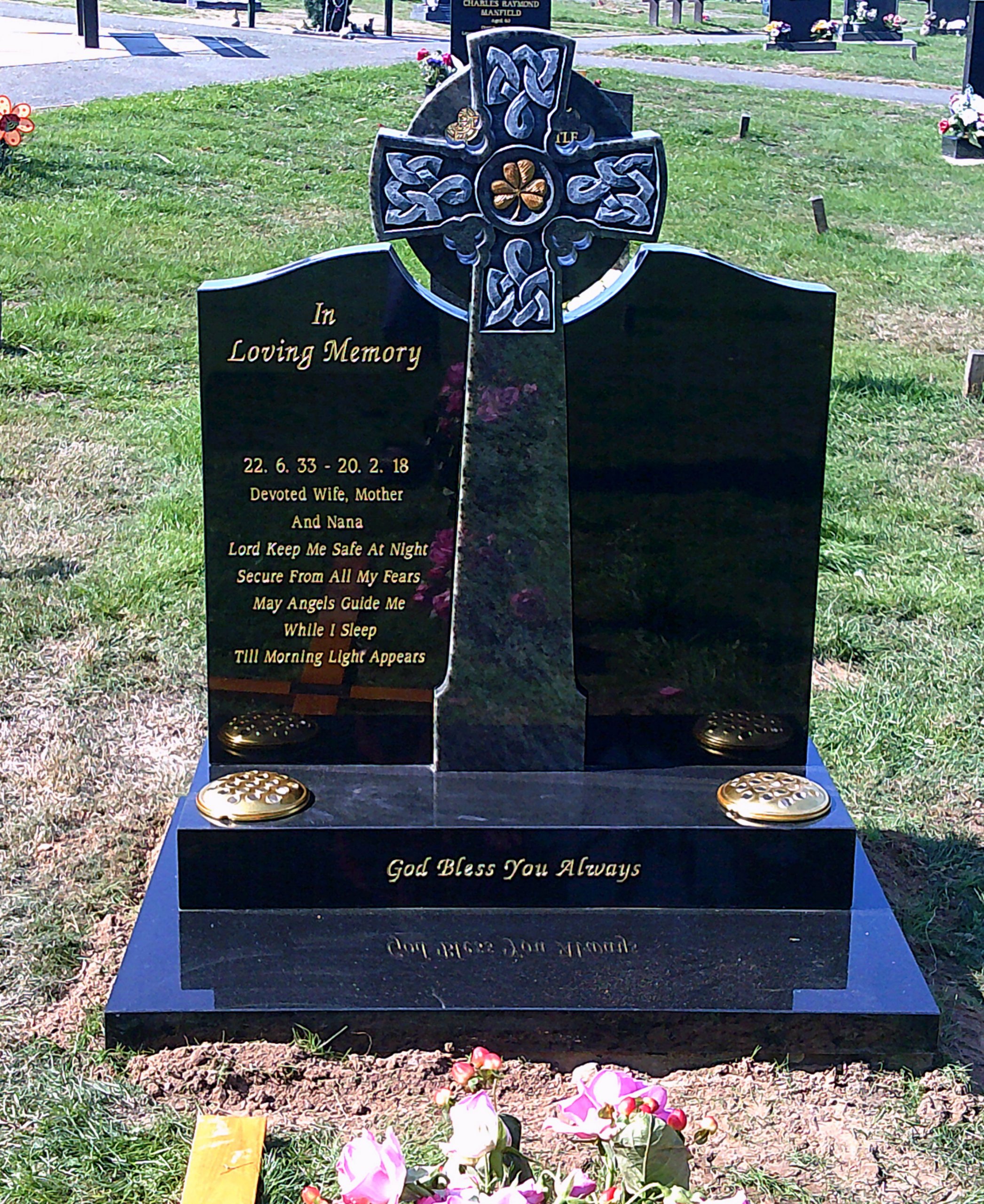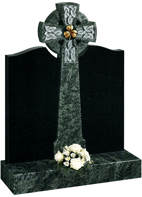 Example Image Shows: All Polished Black and Ocean Green Central Celtic cross with hand carved shamrock and Celtic knot details flanked by contrasting all polished black wings (Any other colour granites can be used).
