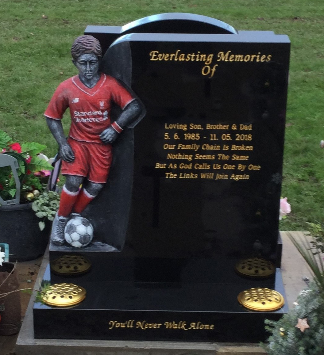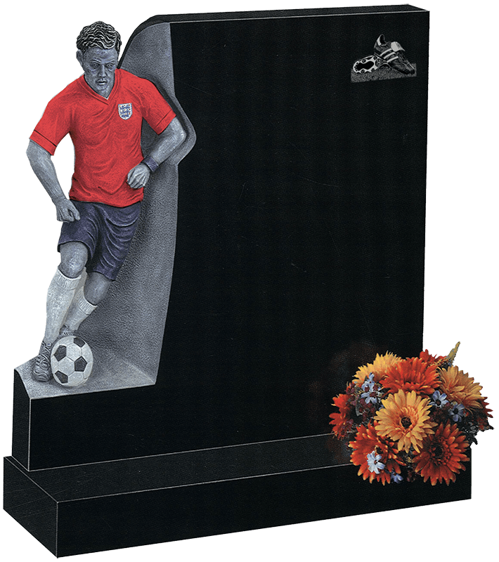 Example Image Shows: All Polished Black Granite This memorial features an impressive hand carved footballer (footballers strip can be changed to suit) Memorial shown with etched football boots (extra cost please enquire)
