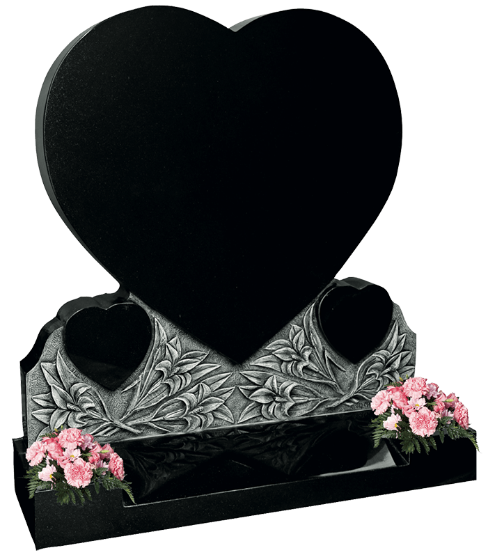 Example Image Shows: All Polished Black This triple heart memorial features stunning carved flowers in an antique finish.